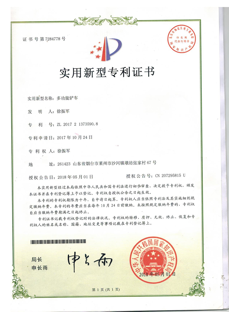 • 獲得“多功能鏟車(chē)抓掉挖一體機(jī)”專(zhuān)利證書(shū),開(kāi)始生產(chǎn)兩頭忙,攪拌斗裝載機(jī),同年更名萊州巨浪機(jī)械有限公司